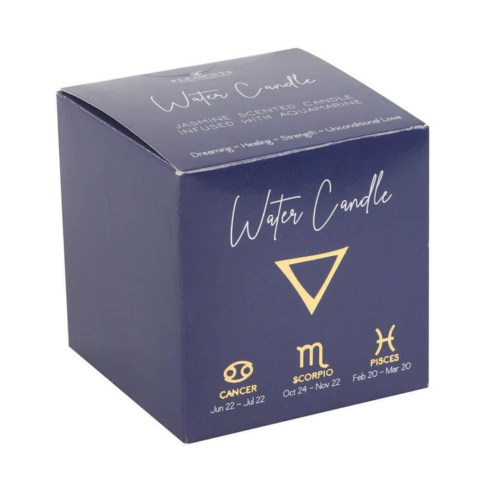 • Representing the 3 water signs, Cancer, Scorpio and Pisces, this lidded candle comes in a lovely Jasmine fragrance with aquamarine crystal chips and features the elemental symbol for water and matching zodiac signs.