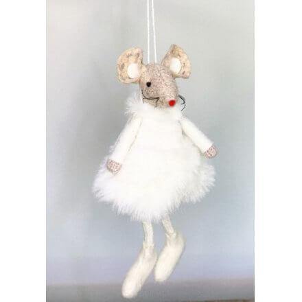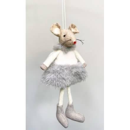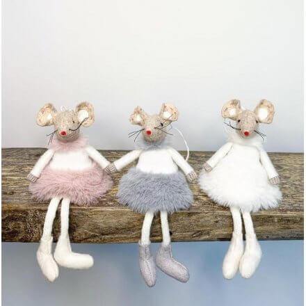 A festive little hanging fabric mouse decoration dressed up in their favourite grey dress and tutu. These little mice can also be used for shelf sitters with their dangly legs.